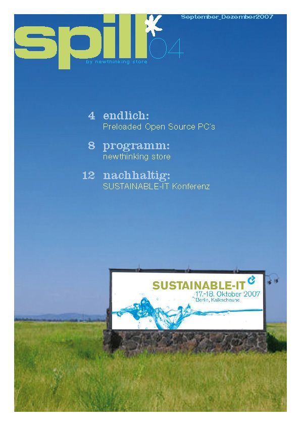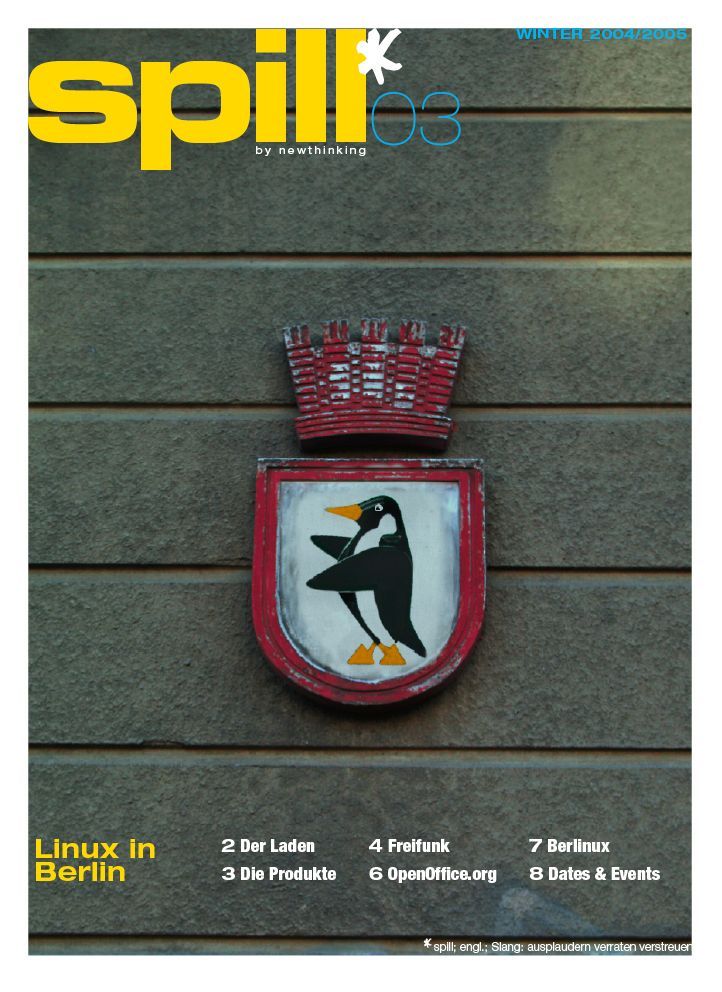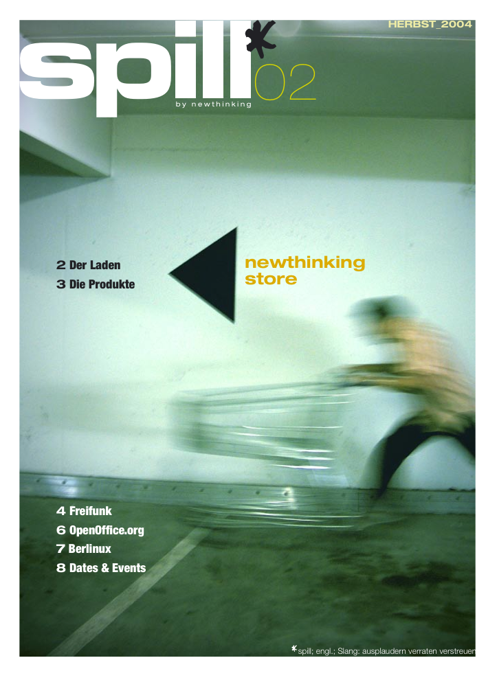 The magazine ‘Spill’ was published between 2004 and 2008. The aim was to publicise the open source movement. The publisher was ‘newthinking communications’.